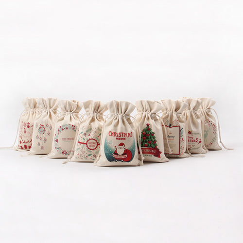 Merry Christmas Santa Claus Xmas Tree Wreath Print Canvas Gift Storage Cinch Bag
